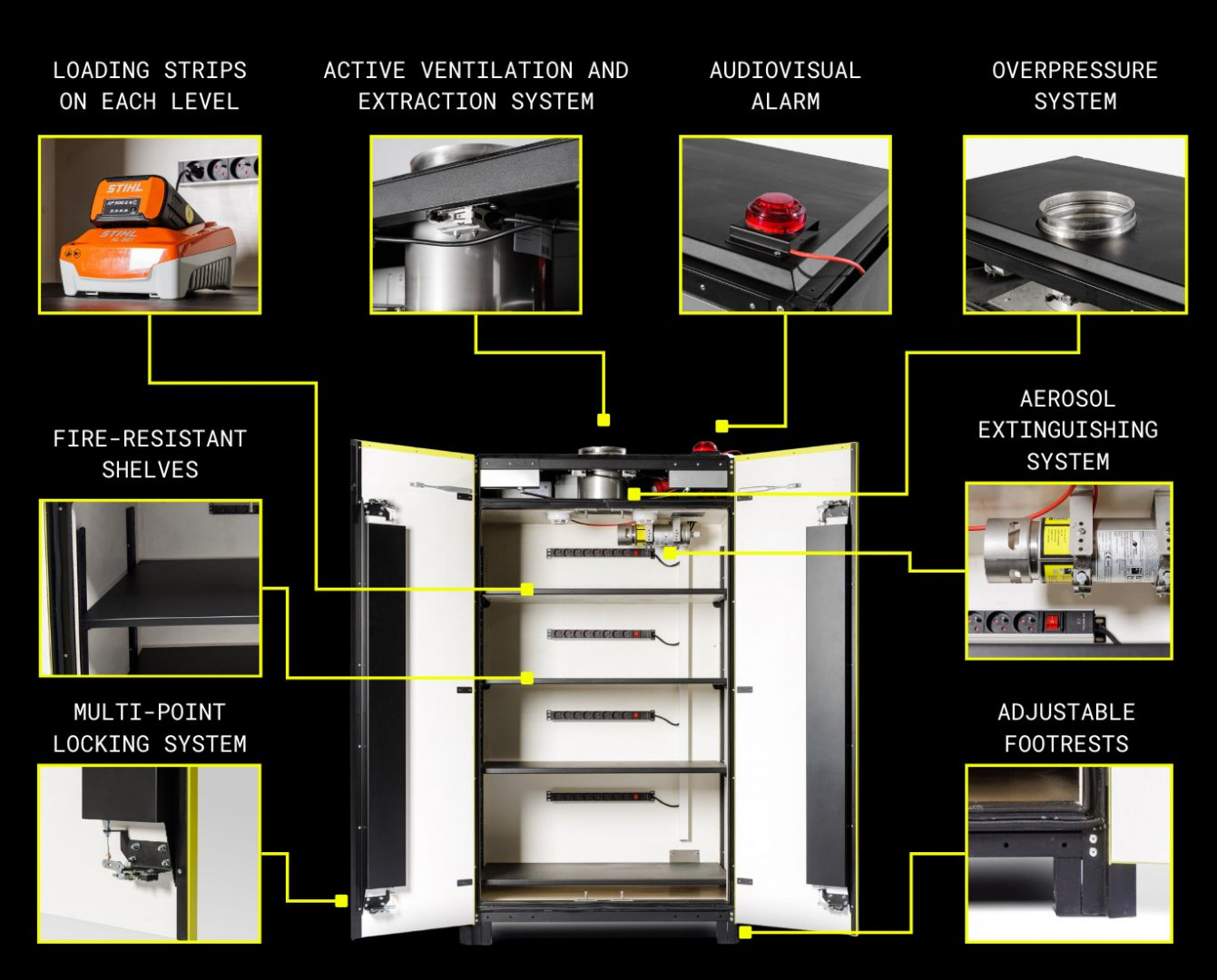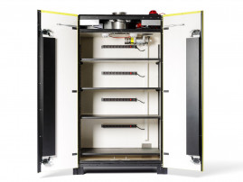 Úložná a nabíjecí skříň je navržena pro bezpečné skladování a nabíjení lithium-iontových baterií v interiéru. Primárně je určena pro baterie z elektrických kol, e-koloběžek, ručního/zahradního nářadí, dronů a vysílaček.